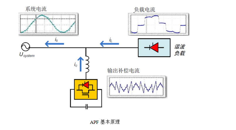 有源电力滤波器并联在电网中,通过外部CT实时检测负载电流,并通过DSP计算,提取负载的谐波分量,采用PWM变流技术,控制IGBT,使内部的变流装置逆变出一个和负载谐波电流大小相等、方向相反的电流注入到电网中,从而实现滤除谐波的功能。